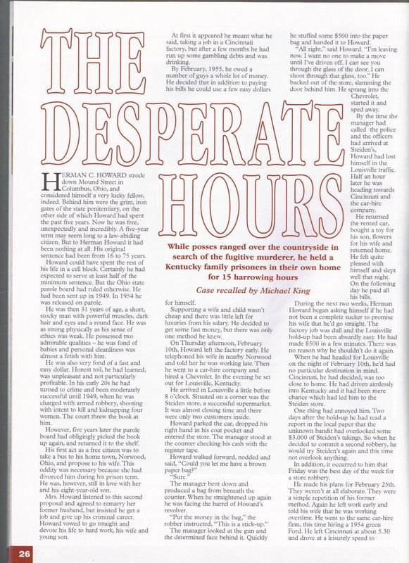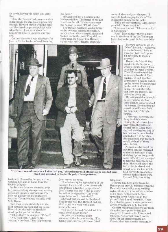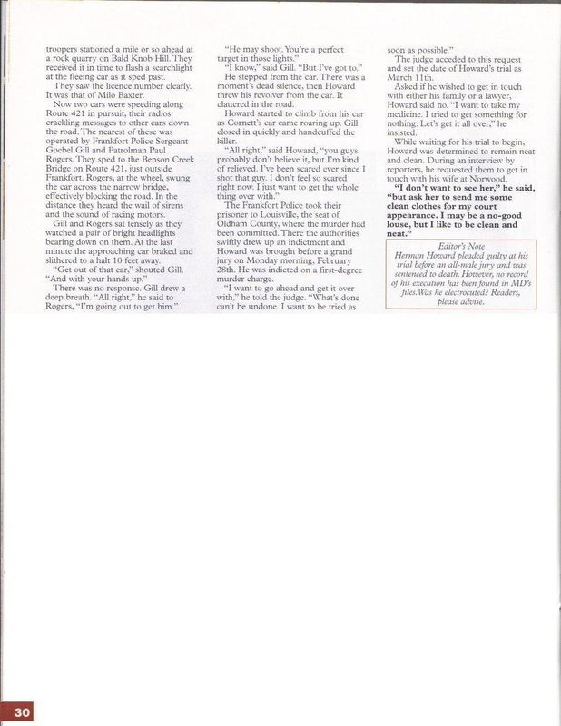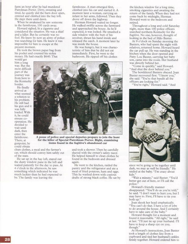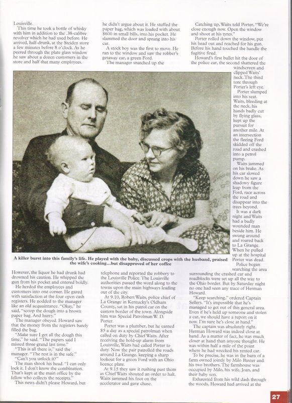 Howard wrecked his vehicle at KY Highway 146 and Ky Highway 153. Fleeing on foot he took a farmer and his family hostage over night while a statewide manhunt was underway. Then stealing the farmer's car the next morning, the murderer headed towards Frankfort Kentucky. The Kentucky State Police arrested Howard as he was entering Frankfort on KY 127 in the stolen car. Herman C. Howard was convicted and sentenced to life in prison for the Murder of Patrolman William D. Porter.